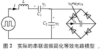 高頻升壓變壓器和高壓整流二極管的分布電容對充電電流的工作狀態(tài)影響較大,是不能被忽略的。變壓器的分布電容較為復(fù)雜,在高頻高壓升壓變壓器中,為減小變壓器體積和漏感,通常采用導(dǎo)磁率較高的鐵芯,如超微晶合金材料,變壓器原邊匝數(shù)較少;為減少變壓器原副邊耦合,通常設(shè)有屏蔽繞組;從而可以忽略原邊分布電容、原、副邊分布電容的影響。變壓器的激磁電抗較大,其影響也可以忽略。于是實際的串聯(lián)諧振電容器充電電路可等效于圖2 所示電路??梢钥闯觯瑢嶋H電路變成了一個串并聯(lián)諧振充電電路。