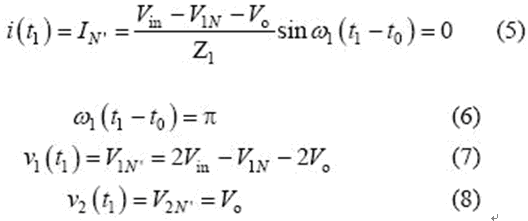 當(dāng)串聯(lián)諧振電流為0(即t1 時刻)時,該模式結(jié)束,可得到如下表達式: