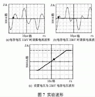 根據(jù)上面所設(shè)計的諧振參數(shù)進行了實驗,實驗波形如圖7 所示??梢钥闯?,為保持充電電流恒定,隨著輸出電壓的升高,開關(guān)頻率變高,實測充電電壓為23kV 時變換器效率為92.7%。實驗表明,所設(shè)計的諧振參數(shù)完全滿足設(shè)計要求,該裝置已用于神光III 能源系統(tǒng)。