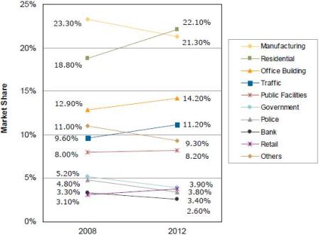 市場對安防產(chǎn)品的需求多種多樣,涉及眾多領域,包括制造、政府、金融、運輸、教育、醫(yī)療保健、住宅及商業(yè)樓宇。在國際市場,安防產(chǎn)品的主要用戶是政府、工業(yè)及個別家庭。在中國,制造業(yè)、住宅與商業(yè)樓宇是營業(yè)收入排在前三位的三大市場領域,合計所占份額超過55%。