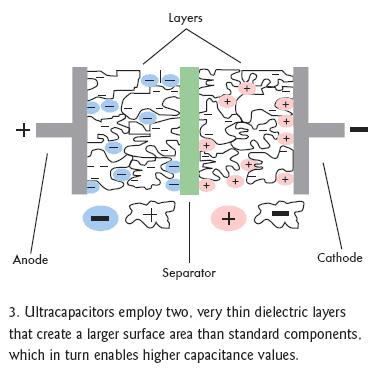 雙電層電容器(EDLC)正如它的字面意義那樣可以解決上述問(wèn)題,它在相同的封裝內(nèi)增加了第二個(gè)電介層,這個(gè)電介層與第一層在中間隔離物的兩邊并行工作(圖3)。EDLC也采用無(wú)孔電介質(zhì),如活性碳、碳納米管、炭黑凝膠,并選用導(dǎo)電聚合物,其存儲(chǔ)容量要比標(biāo)準(zhǔn)的電解材料高出許多。額外層和更高效電介材料的這種組合能使電容容量提高近4個(gè)數(shù)量級(jí)。