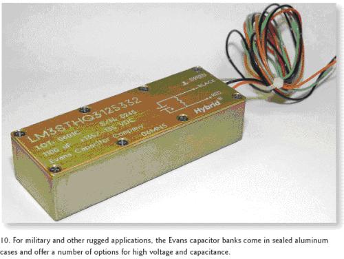 [page]EvansCapacitor公司的3STHQ3和3PTHQ3電容組器件則主要用于任務(wù)繁重的軍事應(yīng)用,它將公司的三個(gè)THQ3混合電容集成進(jìn)了一個(gè)陽(yáng)極電鍍、環(huán)氧密封的鋁殼中,整個(gè)尺寸為4.47×1.59×1.09英寸(圖10)。針對(duì)更高的工作電壓,3STHQ3組可以串聯(lián)電容的方式提供以下四種產(chǎn)品:0.004F/160Vdc,0.0028F/200Vdc,0.0019F/250Vdc和0.0011F/300Vdc。
