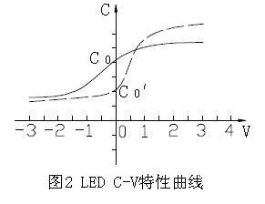 鑒于LED 的芯片有9×9mil (250×250um),10×10mil,11×11mil (280×280um),12×12mil (300×300um),故pn 結(jié)面積大小不一,使其結(jié)電容(零偏壓)C≈n+pf左右。C-V 特性呈二次函數(shù)關(guān)系(如圖2)。由1MHZ 交流信號(hào)用C-V 特性測(cè)試儀測(cè)得。