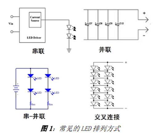 當然,用戶也可以采用并聯(lián)、串聯(lián)-并聯(lián)組合及交叉連接等其它排列方式,用于需要“相互匹配的”LED 正向電壓的應(yīng)用,并獲得其它優(yōu)勢。如在交叉連接中,如果其中某個LED 因故障開路,電路中僅有1 個LED 的驅(qū)動電流會加倍,從而盡量減少對整個電路的影響。