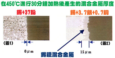 圖1表示當(dāng)使用63/37傳統(tǒng)焊錫時是近乎不會產(chǎn)生混合金屬的,但當(dāng)使用錫+3.7銀+0.7銅的無鉛焊錫時便會產(chǎn)生15微米厚度的混合金屬了(圖2)。