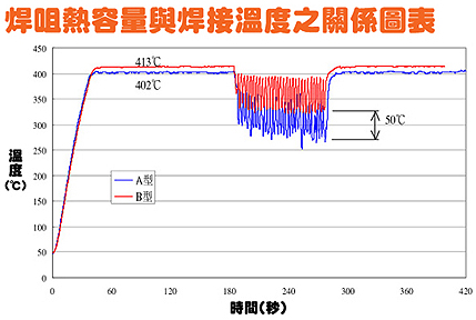 答案是B型。由于B型焊咀比A型咀焊粗(銅的部份),所以B型比A型的熱容量也較大和導(dǎo)熱性較快。雖然兩支焊咀形狀一樣(尖端部份),但B型咀身比較粗,焊咀越粗,銅的部份越大,保持溫度穩(wěn)定的能力也越大。(請參考以下圖表)