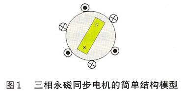 三相混合式步進(jìn)電機(jī)的工作原理十分類似于永磁同步伺服電機(jī)。其轉(zhuǎn)子上所用永磁磁鐵同樣是具有高磁密特性的稀土永磁材料,所以在轉(zhuǎn)子上產(chǎn)生的感應(yīng)電流對轉(zhuǎn)子磁場的影響可忽略不計。在結(jié)構(gòu)上,它相當(dāng)于一種多極對數(shù)的交流永磁同步電機(jī)。由于輸入是三相正弦電流,因此產(chǎn)生的空間磁場呈圓形分布,而且可以用永磁式同步電機(jī)的結(jié)構(gòu)模型(見圖1)分析三相混合式步進(jìn)電機(jī)的轉(zhuǎn)矩特性。為便于分析,可做如下假設(shè):