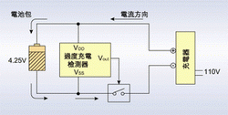 過度充電保護(hù)IC的原理為:當(dāng)外部充電器對(duì)鋰電池充電時(shí),為防止因溫度上升所導(dǎo)致的內(nèi)壓上升,需終止充電狀態(tài)。此時(shí),保護(hù)IC需檢測(cè)電池電壓,當(dāng)?shù)竭_(dá)4.25V時(shí)(假設(shè)電池過充點(diǎn)為4.25V)即激活過度充電保護(hù),將功率MOSFET由開轉(zhuǎn)為切斷,進(jìn)而截止充電。