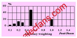 對于傳統(tǒng)電力電子裝置的設計,我們通常是通過每千瓦多少錢來衡量其性價比的。但是對于光伏逆變器的設計而言,對最大功率的追求僅僅是處于第二位的,歐洲效率的最大化才是最重要的。因為對于光伏逆變器而言,不僅最大輸出功率的增加可以轉化為經(jīng)濟效益,歐洲效率的提高同樣可以,而且更加明顯。歐洲效率的定義不同于我們通常所說的平均效率或者最高效率。它充分考慮了太陽光強度的變化,更加準確地描述了光伏逆變器的性能。歐洲效率是由不同負載情況下的效率按照不同比重累加得到的,其中半載的效率占其最大組成部分(見圖1)。