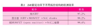 圖16所示拓撲結構允許純無功負載,能夠提高對電網(wǎng)的無功補償,也能滿足雙向功率流動,例如實現(xiàn)高效電池充電。如果應用sic肖特基二極管,這種電路拓撲將可以達到更高的效率等級。表2是2kw額定功率下不同拓撲結構的歐洲效率