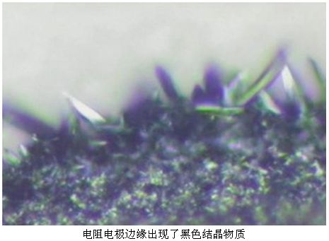 有一批現(xiàn)場(chǎng)儀表在某化工廠使用一年后,儀表紛紛出現(xiàn)故障。經(jīng)分析發(fā)現(xiàn)儀表中使用的厚膜貼片電阻阻值變大,甚至變成開(kāi)路了。把失效的電阻放到顯微鏡下觀察,可以發(fā)現(xiàn)電阻電極邊緣出現(xiàn)了黑色結(jié)晶物質(zhì),進(jìn)一步分析成分發(fā)現(xiàn),黑色物質(zhì)是硫化銀晶體。原來(lái)電阻被來(lái)自空氣中的硫給腐蝕了!