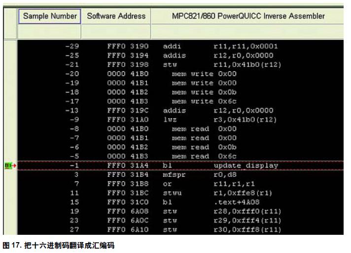 在使用處理器時(shí),特定的十六進(jìn)制字符包含一個(gè)處理器指令。如果您很熟悉十六進(jìn)制代碼,就能查看這些類(lèi)似圖13 所示的十六進(jìn)制代碼表,并知道它們代表的指令。但我們大部分人做不到這一點(diǎn)。因此,絕大多數(shù)分析儀制造商設(shè)計(jì)了稱為反匯編器的軟件包。這些軟件包把十六進(jìn)制代碼轉(zhuǎn)換成易于閱讀的匯編碼。例如圖13中有0000 41B0 和0000 41B1。我們可以從MotorolaPowerQUICC 手冊(cè)中查到它們代表存儲(chǔ)器寫(xiě)0x00 指令。反匯編器可以為我們做這些事情,使我們不需要查找這些代碼。請(qǐng)查看圖17 并注意它們之間的差別。