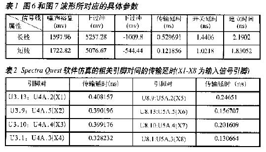 式中,e為介電常數(shù),r為電阻率,w為線寬,l0為芯片之間的平均距離。由式(3)可以看出,信號(hào)線長度對(duì)傳輸質(zhì)量影響很大,可能使信號(hào)在傳輸過程中產(chǎn)生畸變。信號(hào)傳輸質(zhì)量隨著線長的增加而變差,對(duì)于過長的信號(hào)線,應(yīng)采用源端或終端匹配的方法來改善傳輸質(zhì)量。利用信號(hào)完整性仿真工具,可以方便地模擬從驅(qū)動(dòng)端到各芯片的延時(shí),然后結(jié)合仿真結(jié)果對(duì)布局布線進(jìn)行調(diào)整,以達(dá)到預(yù)定的要求。