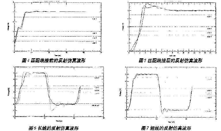用頻率為50MHz,占空比為0.5的Pulse信號(hào)作觸發(fā),圖4和圖5分別為利用Signoise工具仿真得到的匹配端接前、后的仿真波形。從圖中可以看出,端接前,波形在上升沿有畸變發(fā)生,容易引起誤操作。匹配端接有效地消除了信號(hào)的畸變,單調(diào)性很好,而且在上升沿拉升了原信號(hào),提前進(jìn)入電平切換,增加了信號(hào)的穩(wěn)態(tài)時(shí)間,信號(hào)的上升沿也比較平穩(wěn)。雖然在高電平的維持階段有上過沖,但對(duì)信號(hào)確認(rèn)沒有影響,信號(hào)質(zhì)量比較理想。另外,信號(hào)傳輸線長度對(duì)反射也有一定的影響。仿真發(fā)現(xiàn),傳輸線較長時(shí),出現(xiàn)了預(yù)示的反射現(xiàn)象,如圖6所示;而傳輸線較短時(shí),仿真波形和分析結(jié)果吻合得很好,如圖7所示。表1為上述兩種情況下的波形仿真參數(shù)。所以,布線長度不同,其處理方法也應(yīng)不同。一般來說,走線長度小于2英寸,以集總參數(shù)的LC電路來處理;大于8英寸,則以分布參數(shù)的傳輸線電路來對(duì)待。