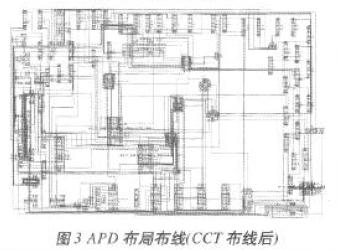 如上所述,MCM布局布線的實(shí)現(xiàn)包括電路原理圖生成、擴(kuò)充零件庫及最終的布局布線完成和加工數(shù)據(jù)文件輸出。APD Layout包括Padstack(*.pad)、Package Symbol(*.psm)、Mechanical Symbol(*.bsm)、Format Symbol (*.osm)和Shape Symbol(*.ssm)五種,MCM布局布線設(shè)計(jì)中,所有的布局都必須有正確的Library Packing。MCM設(shè)計(jì)軟件自帶封裝庫往往不能滿足具體設(shè)計(jì)要求,只有擴(kuò)充零件庫后,才能直接調(diào)用零件進(jìn)行布局布線設(shè)計(jì)及最終的工藝文件輸出。首先利用Padstack Editor軟件擴(kuò)充零件庫,然后對(duì)電路進(jìn)行封裝,并通過Concept HDL給APD軟件導(dǎo)出電連接網(wǎng)表文件,最后完成電路布局布線。以檢測器電路為例,其原理圖主要部分如圖2所示,圖3為CCT(Spectra)布線后的形式。整個(gè)設(shè)計(jì)中,定義了16個(gè)Padstack和81個(gè)封裝符號(hào),進(jìn)行251次調(diào)用Padstack和89次調(diào)用功能單元,其中共用到了251個(gè)元件封裝符號(hào)引腳和229個(gè)功能單元引腳。