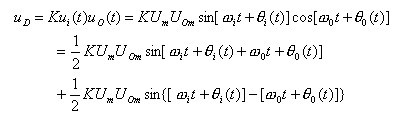 式中的ω0為壓控振蕩器在輸入控制電壓為零或為直流電壓時的振蕩角頻率,稱為電路的固有振蕩角頻率。則模擬乘法器的輸出電壓uD為: