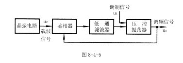 調(diào)頻波的特點是頻率隨調(diào)制信號幅度的變化而變化。由8-4-6式可知,壓控振蕩器的振蕩頻率取決于輸入電壓的幅度。當載波信號的頻率與鎖相環(huán)的固有振蕩頻率ω0相等時,壓控振蕩器輸出信號的頻率將保持ω0不變。若壓控振蕩器的輸入信號除了有鎖相環(huán)低通濾波器輸出的信號uc外,還有調(diào)制信號ui,則壓控振蕩器輸出信號的頻率就是以ω0為中心,隨調(diào)制信號幅度的變化而變化的調(diào)頻波信號。由此可得調(diào)頻電路可利用鎖相環(huán)來組成,由鎖相環(huán)組成的調(diào)頻電路組成框圖如圖8-4-5所示。