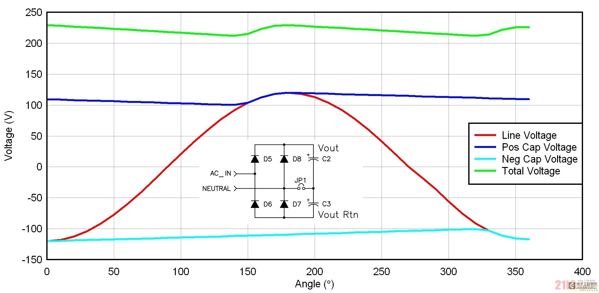 圖 2 描述了一種倍壓器整流配置結(jié)構(gòu),許多 115/230 VAC 應(yīng)用都使用了這種結(jié)構(gòu)。如果您有一個 230 VAC 應(yīng)用,則您的輸入級需要處理最大輸入電壓(265 VAC)乘以峰值因數(shù)這么大的電壓,其接近 400 伏。在與一個 115 VAC 輸入一起使用時,倍壓器將經(jīng)過整流的電壓,增壓至接近 230 VAC 輸入電平。我們可以專為 230 VAC 線壓設(shè)計(jì)一個電源,以此來減小電源工作的整流后電壓范圍。我們通常使用一個跳線或者開關(guān),來實(shí)現(xiàn)不同整流器配置之間的切換。這種方法的唯一缺點(diǎn)是偶爾出現(xiàn)人為倍增 230 VAC 輸入的情況,從而對電源造成嚴(yán)重破壞。圖 2 顯示了倍壓器電路的一些波形。電容之間不帶電。兩個整流器交替對每個電容施加輸入電壓。一個周期中,每個電容都被充電至峰值線壓,這樣它們每個都有一個線頻率紋波部分。由于電容為異相位充電,因此其和的紋波頻率為線頻率的兩倍。