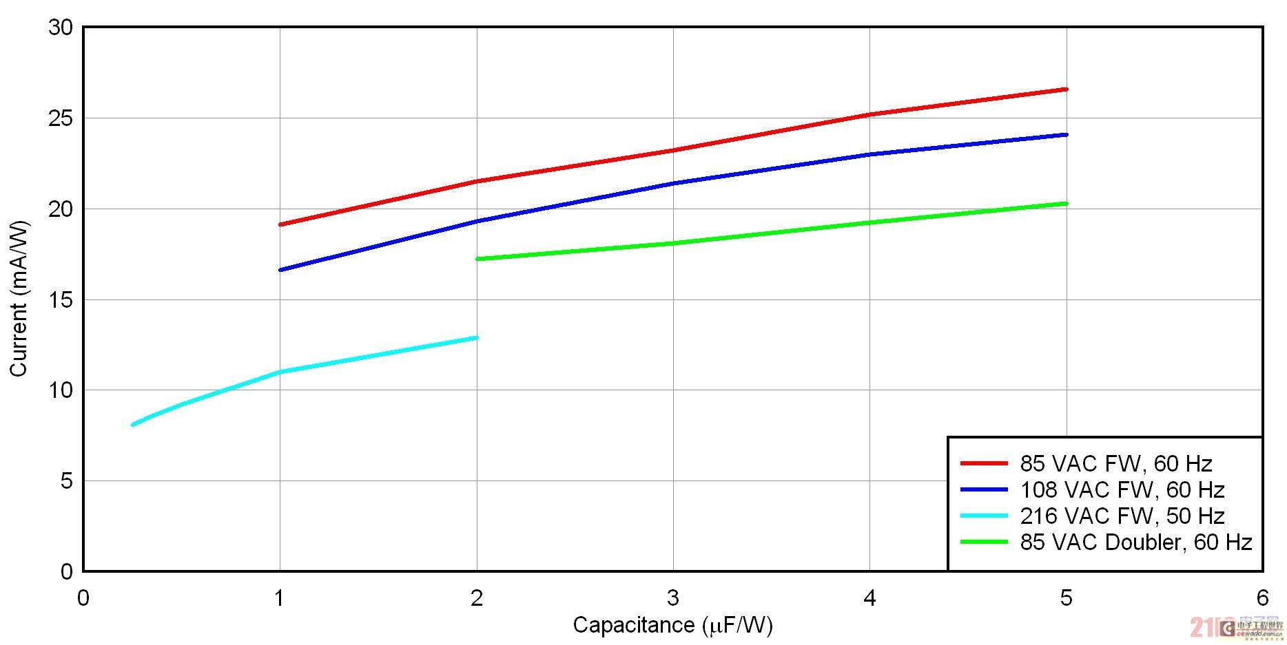 圖 3 顯示了四種整流器/輸入電壓方法的 uF/W 標(biāo)準(zhǔn)化壓降。共有三種全波橋接方法,適用于低線壓美國(108 VAC/60 Hz)、低線壓日本(85 VAC/50 Hz)和低線壓歐洲(216 VAC/50 Hz)。另外,還有一個低線壓日本的倍壓器。就全波橋而言,標(biāo)準(zhǔn)化過程只需將電容除以功率。在倍壓器中,標(biāo)準(zhǔn)化方法是將兩個串聯(lián)電容之一的電容除以功率。要想使用該曲線圖,請首先確定您的整流器配置結(jié)構(gòu),并選擇一個可以接受的壓降。之后,您只需讀取輸入電容的 uF/W 便可。最后,通過乘以您的功率,便可去標(biāo)準(zhǔn)化。