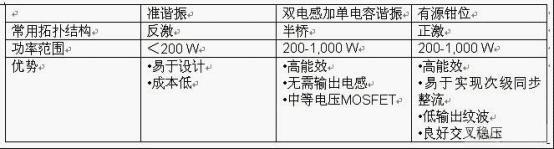 要提高主轉換器能效可以采用以下幾種方法。一是通過降低導通阻抗(開關損耗較高)和/或減小初級峰值電流和均方根電流來降低初級導通損耗;二是考慮采用軟開關技術降低開關損耗;三是通過減少整流器壓降(使用低正向壓降二極管或FET整流器)來降低次級損耗;四是采用更好的磁芯材料來降低磁芯損耗。表1列出了主要軟開關的拓撲結構,可供設計時參考。