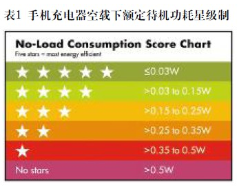 這些關(guān)注的結(jié)果是采取一系列措施來提升效率和降低空載功耗的需求。其中最新最嚴格的是由全球前五大手機廠商提出的一項自愿性的充電器星級制協(xié)定,用以標志在充電完成之后,充電器仍插在壁式插座上時的耗能量。該星級制從0星級開始,最高5星級??蛰d下額定待機功耗大于0.5W的充電器為0星級標簽,待機功耗小于0.03W(30mW)的為5星級(見表1)。通過比較,大多數(shù)現(xiàn)有手機的待機功耗在150~300mW范圍。