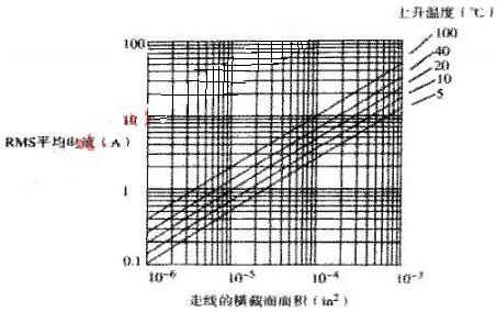 圖2描述了最大的功率輸送能力和溫度上升的關(guān)系。在圖2中,水平軸顯示的是橫截面面積,單位為IN的2次方,縱軸顯示的是該線在給定升溫值時的允許電流。