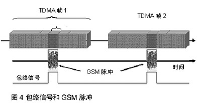 特定的手機(jī)只在屬于它的時(shí)間空當(dāng)發(fā)射。包絡(luò)信號(hào)的基本頻率是1/4.615 ms=217Hz。諧波頻率為434Hz、651Hz等。如此頻率是聽(tīng)得到的。如圖4所示,為手機(jī)的包絡(luò)信號(hào)。