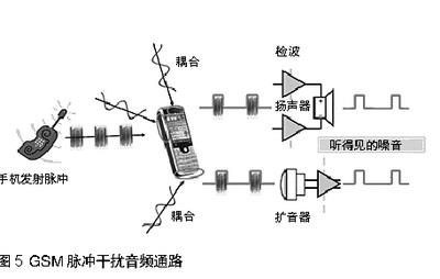當(dāng)手機(jī)與基站通訊,或兩個(gè)手機(jī)彼此接近時(shí),發(fā)射脈沖通過(guò)擴(kuò)音器,揚(yáng)聲器,或頭戴式耳機(jī)線傳人音頻通路。見(jiàn)圖5。