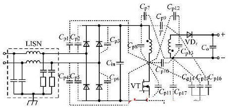 圖2反激式開(kāi)關(guān)電源寄生電容典型的分布