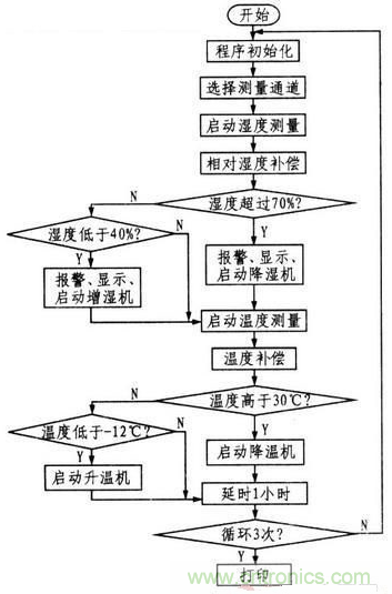 每次測(cè)得的數(shù)據(jù)要和規(guī)定值進(jìn)行比較,如果在允許的范圍內(nèi),則程序進(jìn)行下一步操作,如果不滿足要求.則應(yīng)報(bào)警并將此刻的數(shù)據(jù)值顯示出來(lái),在每次循環(huán)結(jié)束后。要經(jīng)過(guò)1個(gè)小時(shí)(可以靈活選用)的延時(shí).這主要是因?yàn)閺椝巶}(cāng)庫(kù)里有很多木制結(jié)構(gòu),揮發(fā)和吸收水分都有一個(gè)過(guò)程,經(jīng)過(guò)一定延時(shí)再進(jìn)行測(cè)量.可以避免傳感器長(zhǎng)時(shí)間的工作和執(zhí)行機(jī)構(gòu)的反復(fù)啟停,節(jié)約資源,同時(shí)可以延長(zhǎng)系統(tǒng)的使用壽命。每經(jīng)過(guò)3次(根據(jù)需要可以適當(dāng)選擇)循環(huán)測(cè)量后,單片機(jī)控制打印機(jī)將3次測(cè)量的溫/濕度數(shù)據(jù)打印出來(lái),便于報(bào)表和存檔。