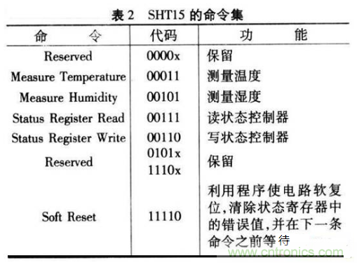 由于SHTl5中含有存儲(chǔ)器,所以設(shè)置初始化程序主要是對(duì)單片機(jī)和SHTl5的存儲(chǔ)器中的一些數(shù)據(jù)置初值,同時(shí)對(duì)單片機(jī)的初態(tài)進(jìn)行初始化。該系統(tǒng)是多通道的測(cè)量系統(tǒng).SHTl5上電后經(jīng)過(guò)10ms時(shí)間就進(jìn)入休眠狀態(tài),只有當(dāng)單片機(jī)發(fā)出測(cè)量命令后,SHTl5才被“喚醒”而進(jìn)行工作,所以.單片機(jī)循環(huán)對(duì)各個(gè)傳感器發(fā)出溫,濕度測(cè)量命令,實(shí)現(xiàn)多通道的溫,濕度測(cè)量。SHTl5的命令集如表2所列。