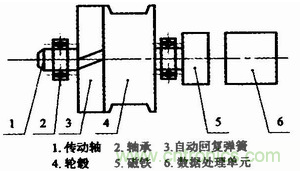 基于磁敏角度技術(shù)的拉線式位移傳感器的功能是將拉線的機(jī)械位移換成可以計量、記錄或傳送的電信號,主要由自動回復(fù)彈簧、輪轂、磁鐵以及數(shù)據(jù)處理單元等部分構(gòu)成,結(jié)構(gòu)如圖1所示。