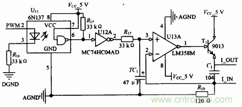 數(shù)據(jù)處理單元具備一路可控4~20 mA的電流輸出,用于現(xiàn)場指示儀表的驅(qū)動。具體的連接電路如圖4所示。其中PWM2連接ARM的PWM2引腳,PWM信號用于控制光耦的導(dǎo)通與截止,反相器主要用于波形的整定,根據(jù)磁敏角度和位移關(guān)系,建立數(shù)學(xué)模型,計算出PWM的占空比,從而達(dá)到電流大小調(diào)節(jié)的目的。