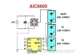 它首先要測量輸入電壓,等到輸入電壓達到一定值以后,開始接通第一串恒流于比較低值的LED;到達更高一些的電壓以后就開始在第一串后面再接上第二串LED并恒流于更高的電流;最后等到電壓更高以后,再接通第三串LED并恒流于更高值的電流。所以它的內部結構是很復雜的。