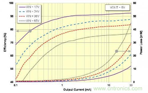 圖 3:LM5165 降壓型轉(zhuǎn)換器的典型效率(輸出額定值針對(duì) 5V/25mA 擬訂)