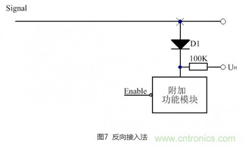 反向接入方法如圖7所示,與正向接入不同的是,二極管的正極接到信號(hào)線上,UH接至高電平。