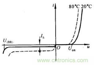 在環(huán)境溫度升高時(shí),二極管的正向特性曲線將左移,反向特性曲線將下移,如圖1所示。在室溫附近,溫度每升高1℃,正向壓降減小2~2.5mV;溫度每升高10℃,反向電流約增大一倍。可見(jiàn),二極管的特性對(duì)溫度很敏感。
