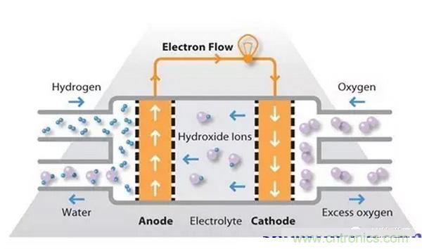 氫燃料在陽(yáng)極處被處理,其中電子與鉑基催化劑的表面上的質(zhì)子分離。質(zhì)子通過(guò)膜到達(dá)電池的陰極側(cè),同時(shí)電子在外部電路中行進(jìn),產(chǎn)生電池的電輸出。在陰極側(cè),另一個(gè)貴金屬電極將質(zhì)子和電子與氧氣結(jié)合以產(chǎn)生水,其作為唯一的廢物排出;氧可以以純化形式提供,或者在電極處直接從空氣中提取。