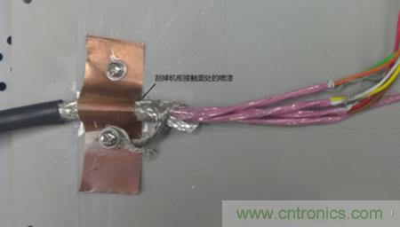 從安全方面考慮,三個(gè)機(jī)柜都必須接大地,強(qiáng)電線路與信號線分開避免干擾這些都是要遵循的基本原則。實(shí)際機(jī)柜間位置較遠(yuǎn),接地對于高頻干擾改善不多,只作為安全措施。解決這種問題一般考慮是從干擾源、傳播路徑、敏感設(shè)備三方面著手。驅(qū)動器和功率分析儀是成型的設(shè)備,不便于改動,考慮從傳播路徑入手,使用多芯屏蔽電纜連接扭矩傳感器到測控柜,傳感器端屏蔽層連接到傳感器外殼,也與電機(jī)平臺連通,另一側(cè)屏蔽層接到測控柜機(jī)殼。最初的時(shí)候屏蔽層通過一根較長的線連接到測控柜,發(fā)現(xiàn)并沒有改善,最后使用銅片將整根線壓到機(jī)柜,干擾得到很大衰減。