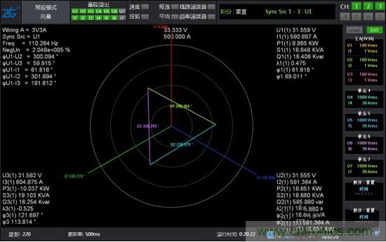 此時(shí)將系統(tǒng)運(yùn)行起來,通過功率分析儀的數(shù)據(jù)和波形再次進(jìn)行驗(yàn)證,電壓波形圖和矢量圖都很完美。