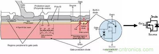 至于為什么不使用耗盡型的MOS管,不建議刨根問底。對于這兩種增強型MOS管,比較常用的是NMOS。原因是導(dǎo)通電阻小且容易制造。所以開關(guān)電源和馬達(dá)驅(qū)動的應(yīng)用中,一般都用NMOS。下面的介紹中,也多以NMOS為主。在MOS管原理圖上可以看到,漏極和源極之間有一個寄生二極管。這個叫體二極管,在驅(qū)動感性負(fù)載(如馬達(dá)),這個二極管很重要。順便說一句,體二極 管只在單個的MOS管中存在,在集成電路芯片內(nèi)部通常是沒有的。下圖是MOS管的構(gòu)造圖,通常的原理圖中都畫成右圖所示的樣子。 (柵極保護(hù)用二極管有時不畫)