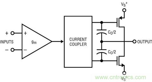 圖 1a 顯示了一個(gè)非軌至軌放大器的方框圖。輸入控制 gm 方框,gm 方框驅(qū)動(dòng)增益節(jié)點(diǎn),并在輸出端得到緩沖。補(bǔ)償電容器 Cc 是主要的頻率響應(yīng)組件。Cc 的返回引腳應(yīng)該接地,如果有這樣一個(gè)引腳的話;但是運(yùn)算放大器傳統(tǒng)上不接地,電容器電流會(huì)返回一個(gè)或兩個(gè)電源。圖 1b 是最簡單的軌至軌輸出放大器的方框圖。輸入方框 gm 的輸出電流通過“電流耦合器”發(fā)送,這將驅(qū)動(dòng)電流分成兩部分,提供給輸出晶體管。頻率響應(yīng)由兩個(gè) Cc/2s 決定,二者實(shí)際上是并聯(lián)的。