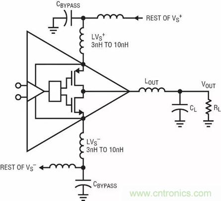 最后一個(gè)需要考慮的振蕩源是電源旁路。圖 10 顯示了輸出電路的一部分。LVS+ 和 LVS– 是不可避免的封裝、IC 接合線、旁路電容器的物理長度 (像任何導(dǎo)體一樣也是電感性的) 以及電路板走線的串聯(lián)電感。還包括將局部旁路組件連接到電源總線其余部分 (如果不是電源平面) 的外部電感。盡管 3nH 至 10nH 看起來似乎不大,但是在 200MHz 時(shí),就是 3.8 至 j12Ω。如果輸出晶體管傳導(dǎo)大的高頻輸出電流,那么在電源電感兩端會(huì)存在壓降。