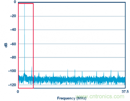 有多種方法可以減少落入紅框內(nèi)的噪聲量。其中一種是選擇具有更好SNR(噪聲更低)的ADC?;蛘咭部梢允褂孟嗤琒NR的ADC并提供更快的時鐘(比如150 MHz),從而讓噪聲分布在更寬的帶寬內(nèi),使紅框內(nèi)的噪聲更少。