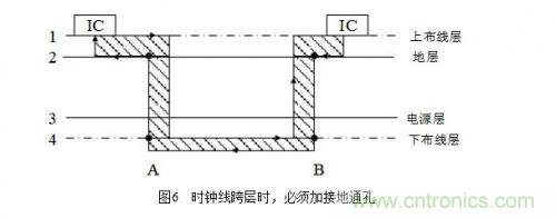 在布線時(shí)盡量少穿過孔,因?yàn)檫^孔阻抗和線阻抗不一樣,存在阻抗突變,從而產(chǎn)生駐波使信號(hào)變壞,容易形成輻射,尤其是在時(shí)鐘需要穿層時(shí),要做技術(shù)處理,時(shí)鐘線跨層時(shí)的處理如圖6所示。