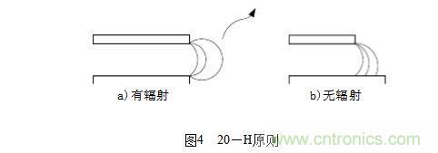 (1)20-H原則,決定印制線條間的距離,表述如下:所有的具有一定電壓的PCB都會(huì)向空間輻射電磁能量(如圖4a),為減小這個(gè)效應(yīng),PCB的物理尺寸都應(yīng)該比最靠近的接地板的物理尺寸小20H(其中H是兩層PCB的間距),即3mm左右,這樣可使輻射強(qiáng)度下降70%(如圖4b)。20-H原則示意圖如圖4所示: