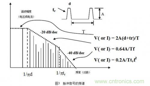 在EMC中,除了基本頻率外,還需考慮諧波因素,通常取十倍頻,但在數(shù)字電路中卻有些不同,比如在時(shí)鐘電路和邏輯門電路中,輻射帶寬與數(shù)字信號(hào)的上升沿或下降沿有關(guān)系,而不是數(shù)字信號(hào)的重復(fù)周期,其關(guān)系為:rtF?/1max?,其中rt是脈沖的上升沿時(shí)間。例如,典型時(shí)鐘驅(qū)動(dòng)的邊沿速率是2ns,此時(shí),maxF≈160MHz,再考慮十倍頻,則此時(shí)鐘電路可能產(chǎn)生直到1.6GHz的輻射帶寬。所以在選擇器件時(shí)要選擇慢速的邏輯器件系列,因?yàn)槠骷?duì)電磁輻射貢獻(xiàn)的大小與工作頻率無直接關(guān)系而只取決于邊沿速率(這和從電路功能設(shè)計(jì)上選擇快速器件是矛盾的,在電路設(shè)計(jì)時(shí)需要折中考慮)。還有從器件的抗擾能力上來說,CMOS器件是最好的,因?yàn)樗脑肼暼菹薷摺姆庋b上來說,BGA是最好的,因?yàn)樗囊€很短。脈沖信號(hào)的頻譜如圖3所示。