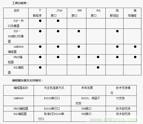 編程器型號(hào)有GANG430(RS232串行接口,串口、1拖8,支持JTAG、SBW,不支持BSL),PRGS430-IIIA多功能編程器(支持JTAG、SBW、BSL),這些編程器都可以做離線燒寫(xiě),并且支持燒寫(xiě)熔絲,即脫離計(jì)算機(jī)來(lái)對(duì)目標(biāo)板燒寫(xiě),其中PRGS編程器還支持序列號(hào)燒寫(xiě)方式。另還有專(zhuān)門(mén)的BSL編程器,只支持BSL接口,不支持燒寫(xiě)熔絲。