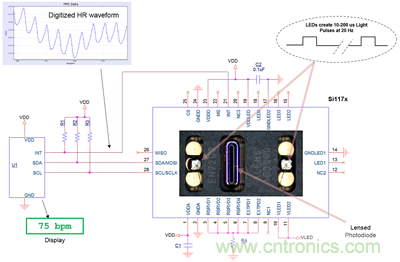 圖3以Silicon Labs的Si118x光學傳感器為例來說明電路原理,基于此器件可以相對方便地實現心率檢測設計。工程師只需專注于設計的光學部分,其中包括電路板上各部分間的光學單元和將該系統(tǒng)如何與皮膚配合。