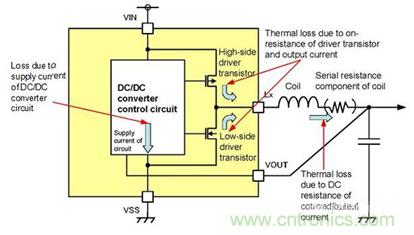 使用DC/DC轉(zhuǎn)換器所期待的最大目的之一是高效率地轉(zhuǎn)換能量。提高效率的方法在于降低損耗。如圖3所示,作為發(fā)生損耗的問(wèn)題,可以列舉IC的消耗電流、驅(qū)動(dòng)器晶體管導(dǎo)通電阻產(chǎn)生的熱損耗,線圈的串聯(lián)連接而產(chǎn)生的損耗等重大原因。